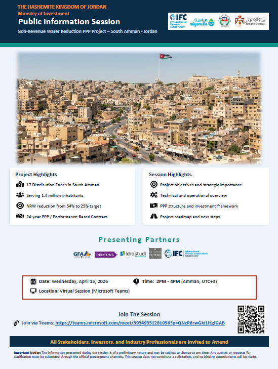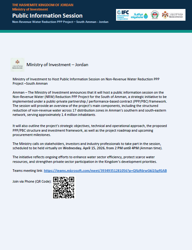 Amman – The Ministry of Investment announces that it will host a public information session on the Non-Revenue Water (NRW) Reduction PPP Project for the South of Amman, a strategic initiative to be implemented under a public-private partnership / performance-based contract (PPP/PBC) framework.