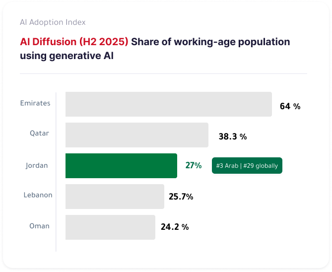 Jordan ranked third among Arab countries and 29th globally in the Artificial Intelligence Adoption Index, which measures Al uptake among the working-age population. The ranking covers 147 economies and is based on the Al Difusion Report issued by Microsoft's Institute for Al Economics for the second half of 2025.