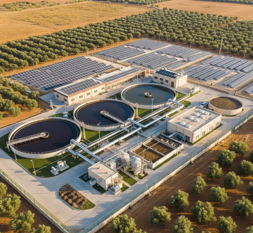 Turning olive mill waste (Zibar) into value: advanced treatment for solids and liquids, reuse of water for irrigation, powered by solar energy.